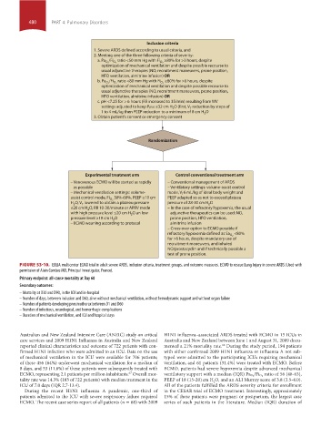 FIGURE 53-10. EOLIA multicenter ECMO trial in adult severe ARDS, inclusion criteria, treatment groups, and outcome measures. ECMO to rescue Lung Injury in severe ARDS (Used with