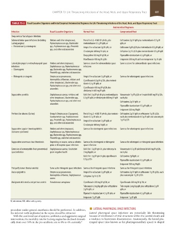 TABLE 73-2 Usual Causative Organisms and Initial Empirical Antimicrobial Regimens for Life-Threatening Infections of the Head, Neck, and Upper Respiratory Tract
