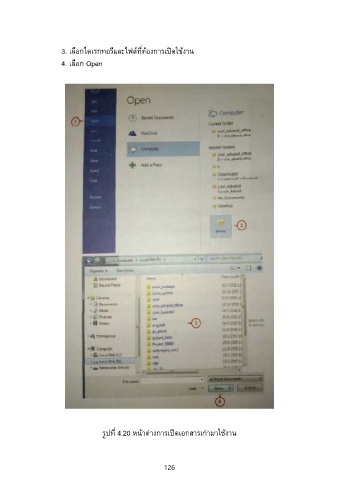 3. เลือกไดเรกทอรีและไฟล์ที่ต้องการเปิดใช้งาน 4. เลือก Open รูปที่ 4.20 หน้าต่างการเปิดเอกสารเก่ามาใช้งาน 126