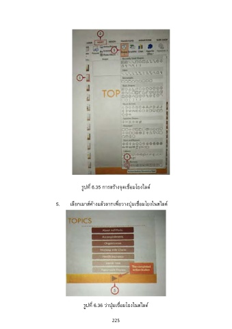 ่ ่ รูปที 6.35 การสร้างจุดเชือมโยงไลด์ 5. เลือกเมาส์ค้างแล้วลากเพือวางปุมเชือมโยงในสไลด์ ่ ่ ่ ่ ่ รูปที 6.36 ว่าปุมเชือมโยงในสไลด์ ่ 225