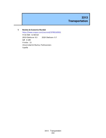 3313 Transportation 1 Revista de Economia Mundial https://www.scopus.com/sourceid/19700169301 Print-ISSN 15760162 2019 CiteScore 0.5 2020 CiteScore 0.7 SJR 0.189 H index 11 Universidad de Huelva, Publicaciones España 3313 - Transportation 233
