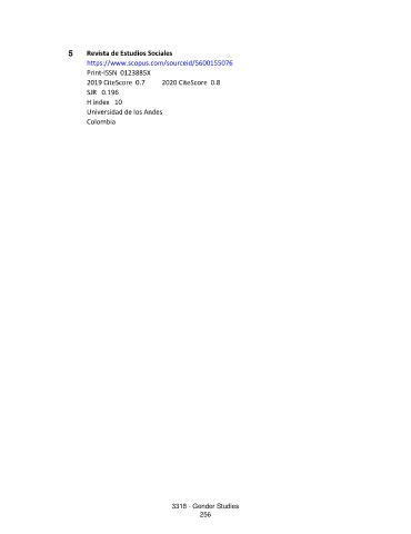 5 Revista de Estudios Sociales https://www.scopus.com/sourceid/5600155076 Print-ISSN 0123885X 2019 CiteScore 0.7 2020 CiteScore 0.8 SJR 0.196 H index 10 Universidad de los Andes Colombia 3318 - Gender Studies 256