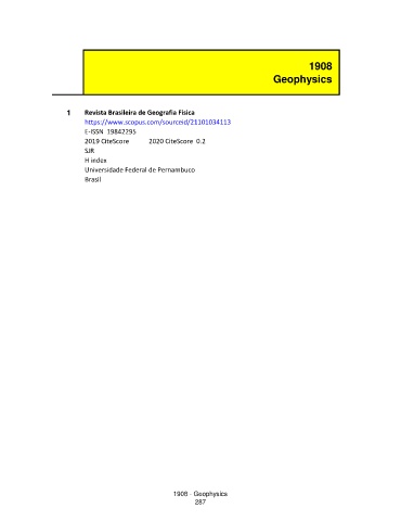 1908 Geophysics 1 Revista Brasileira de Geografia Fisica https://www.scopus.com/sourceid/21101034113 E-ISSN 19842295 2019 CiteScore 2020 CiteScore 0.2 SJR H index Universidade Federal de Pernambuco Brasil 1908 - Geophysics 287