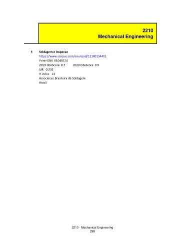 2210 Mechanical Engineering 1 Soldagem e Inspecao https://www.scopus.com/sourceid/12100154401 Print-ISSN 01049224 2019 CiteScore 0.7 2020 CiteScore 0.9 SJR 0.232 H index 11 Associacao Brasileira da Soldagem Brasil 2210 - Mechanical Engineering 299