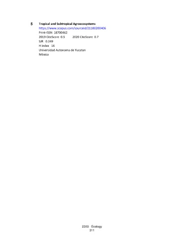 5 Tropical and Subtropical Agroecosystems https://www.scopus.com/sourceid/21100200406 Print-ISSN 18700462 2019 CiteScore 0.5 2020 CiteScore 0.7 SJR 0.249 H index 16 Universidad Autonoma de Yucatan México 2303 - Ecology 311