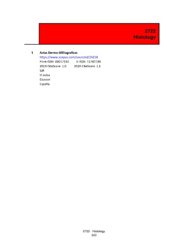 2722 Histology 1 Actas Dermo-Sifiliograficas https://www.scopus.com/sourceid/24218 Print-ISSN 00017310 E-ISSN 15782190 2019 CiteScore 1.0 2020 CiteScore 1.1 SJR H index Elsevier España 2722 - Histology 343