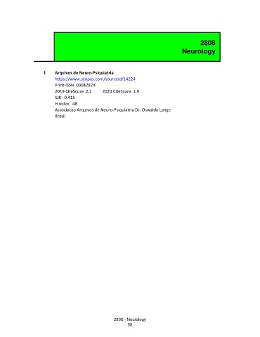 2808 Neurology 1 Arquivos de Neuro-Psiquiatria https://www.scopus.com/sourceid/14224 Print-ISSN 0004282X 2019 CiteScore 2.1 2020 CiteScore 1.9 SJR 0.415 H index 48 Associacao Arquivos de Neuro-Psiquiatria Dr. Oswaldo Lange Brasil 2808 - Neurology 58