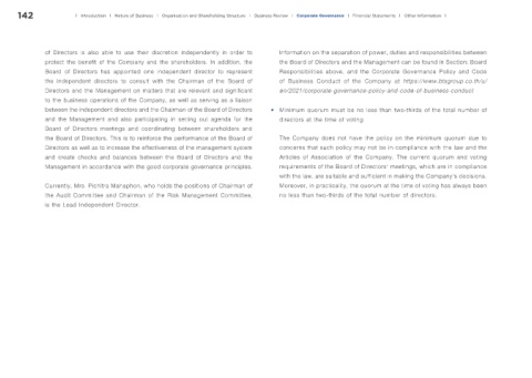Currently, Mrs. Pichitra Mahaphon, who holds the positions of Chairman of Moreover, in practicality, the quorum at the time of voting has always been Internal Audit Office Office of the Chairman Chief Executive Officer Company Secretary