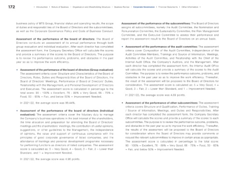 business policy of BTS Group, financial status and operating results, the scope Assessment of the performance of the subcommittees: The Board of Directors