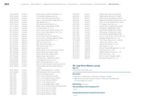 2020-2021 Director Vienna House Baden-Baden GmbH Nationality : Chinese