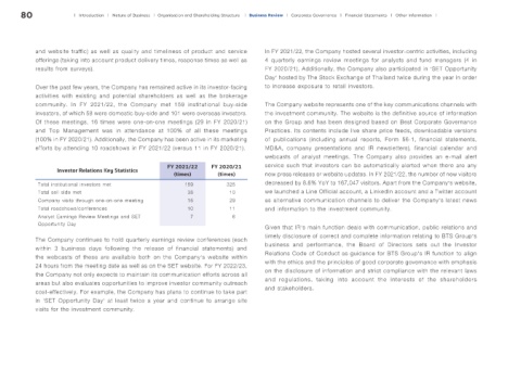and website traffic) as well as quality and timeliness of product and service In FY 2021/22, the Company hosted several investor-centric activities, including