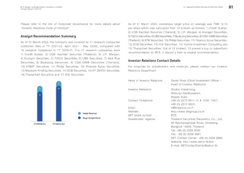 As of 31 March 2022, the Company was covered by 17 research companies (Thailand), 9) KTB Securities, 10) Phillip Securities, 11) Finansia Syrus Securities,