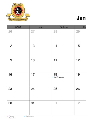 Januari Ahad Isnin Selasa Rabu Khamis Jumaat Sabtu 26 27 28 29 30 31 1 2 3 4 5 6 7 8 9 10 11 12 13 14 15 16 17 18 19 20 21 22 Hari Thaipusam 23 24 25 26 27 28 29 30 31 1 2 3 4 5 Pulang Cuti Umum Bermalam