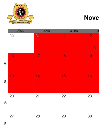 November Ahad Isnin Selasa Rabu Khamis Jumaat Sabtu 30 31 1 2 3 4 5 SPMRSM 31 Okt – 17 Nov 6 7 8 9 10 11 12 A 13 14 15 16 17 18 19 B 20 21 22 23 24 25 26 A Sky High Science Camp 25 – 27 Nov 2022 27 28 29 30 1 2 3 B