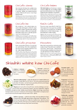 Zawierają błonnik, który korzystnie wpływa na florę Trzy filiżanki Chi-Cafe balans dostarczają około jed- aromacie. ści i długiego życia. ze szlachetnymi odmia-