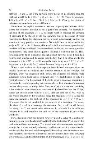 1.58 ∈{x ∈ R | x < 9} but 1.58 /∈{x ∈ Z | x < 9}. Clearly, the choice of