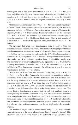 Notice that we found that the statement ∀x∃y(x + y = 5) is true, but
