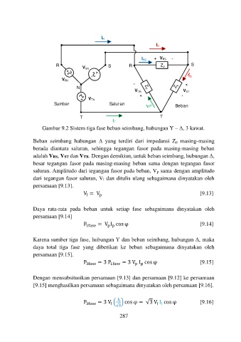 Gambar 9.2 Sistem tiga fase beban seimbang, hubungan Y – Δ, 3 kawat.