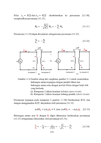 Persamaan tegangan pada kumparan 2 gambar 11.3(b) berdasarkan KVL dan