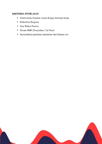 KRITERIA PENILAIAN ▪ Sistem kerja berjalan sesuai dengan deskripsi kerja ▪ Efektifitas Program ▪ Sisa Waktu Peserta ▪ Desain HMI (Penyisihan 2 & Final) ▪ Serta kriteria penilaian tambahan dari Dewan Juri