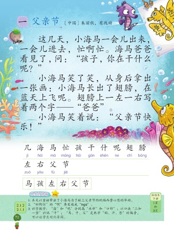 1. 本文以童话带出了小海马为了献上父亲节的祝福而费心思的举动。 下册
