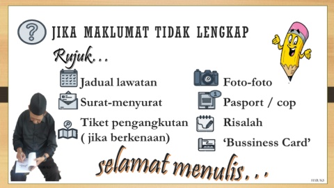 JIKA MAKLUMAT TIDAK LENGKAP Jadual lawatan Foto-foto Surat-menyurat Pasport / cop Tiket pengangkutan Risalah ( jika berkenaan) ‘Bussiness Card’ HAR/KS HAR/KS