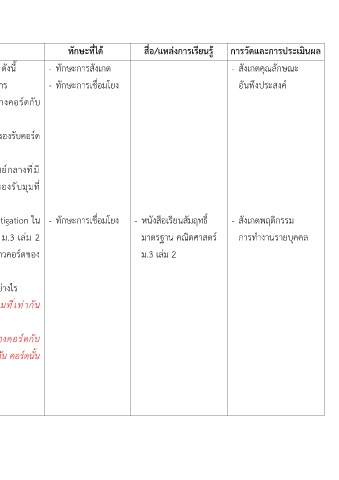 ตัวชี้วด/จุดประสงค์การเรียนร กิจกรรมการเรียนร ทักษะที่ได สื่อ/แหล่งการเรียนร การวัดและการประเมินผล