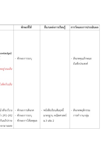 ตัวชี้วด/จุดประสงค์การเรียนร กิจกรรมการเรียนร ทักษะที่ได สื่อ/แหล่งการเรียนร การวัดและการประเมินผล