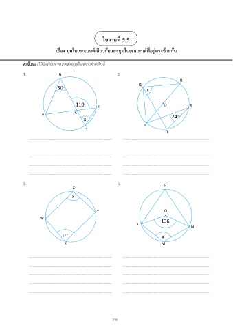 ใบงานที่ 5.5 เรื่อง มุมในเซกเมนต์เดียวกันและมุมในเซกเมนต์ที่อยู่ตรงข้ามกัน คำชี้แจง : ให้นักเรียนหาขนาดของมุมที่ไม่ทราบค่าต่อไปน ี้ 1. B 2. R 50 ๐ Q x 110 E O S ๐ C A 24 ๐ x P D T 3. 4. S Z x Y O W 136 T ๐ N 87 ๐ x X M 219