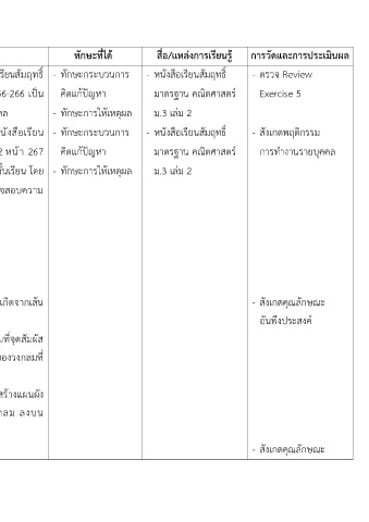 ตัวชี้วด/จุดประสงค์การเรียนร กิจกรรมการเรียนร ทักษะที่ได สื่อ/แหล่งการเรียนร การวัดและการประเมินผล