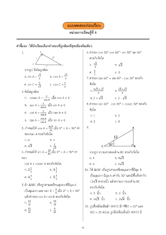 ข. sec A = 1 เมื่อ sin A ≠ 0 8. ค่าของ sec 60° - cot 45° + cosec 30° ตรงกับ