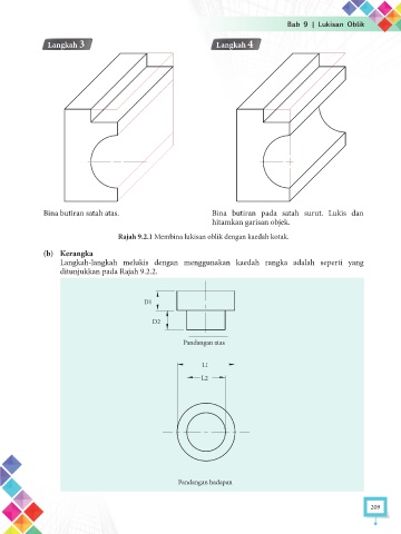 Rajah 9.2.1 Membina lukisan oblik dengan kaedah kotak.