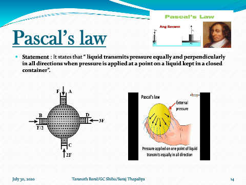 Pascal’s law Statement : It states that “ liquid transmits pressure equally and perpendicularly in all directions when pressure is applied at a point on a liquid kept in a closed container”. July 30, 2020 Taranath Baral/GC Shiba/Suraj Thapaliya 14