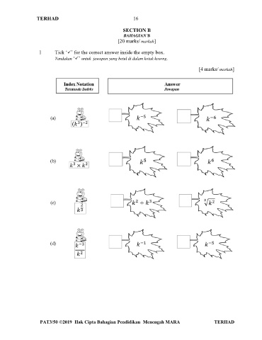 TERHAD 16 SECTION B BAHAGIAN B [20 marks/ markah] 1 Tick ‘’ for the correct answer inside the empty box. Tandakan ‘’ untuk jawapan yang betul di dalam kotak kosong. [4 marks/ markah] PAT3/50 ©2019 Hak Cipta Bahagian Pendidikan Menengah MARA TERHAD