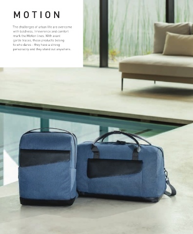 MO T I O N The challenges of urban life are overcome with boldness. Irreverence and comfort mark the Motion lines. With avant garde traces, these products belong to who dares - they have a strong personality and they stand out anywhere.