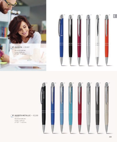 04 03 15 27 06 28 WR MARIETA • 81187 Aluminum ball pen. Ø11 x 139 mm PDP - 7 x 50 mm 03 14 24 44 05 07 47 67 MARIETA METALLIC • 81188 Aluminum ball pen. Ø11 x 139 mm PDP - 7 x 50 mm 153