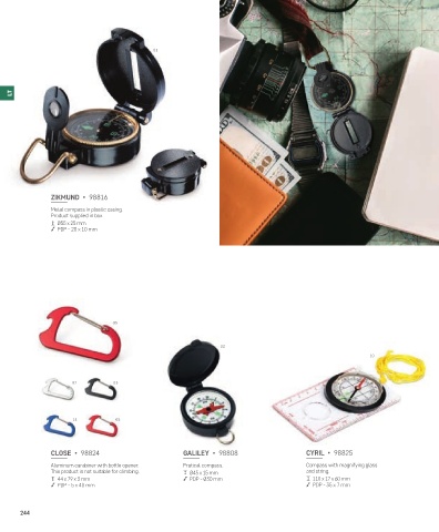 Aluminum carabiner with bottle opener. Pratical compass. Compass with magnifying glass