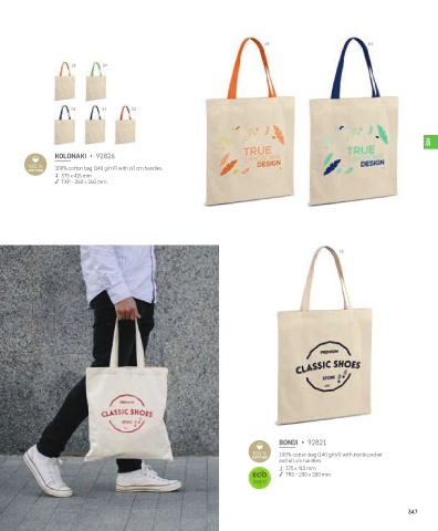 28 04 28 09 04 03 05 SH KOLONAKI • 92826 100% cotton bag (140 g/m²) with 60 cm handles. 375 x 415 mm TXP - 260 x 260 mm 50 BONDI • 92821 100% cotton bag (140 g/m²) with inside pocket and 60 cm handles. 375 x 415 mm TRS - 200 x 280 mm 347