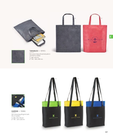 04 05 SH TARABUCO • 92921 Non-woven bag with printed pattern and thermo sealed. 380 x 415 mm TRS - 200 x 280 mm 19 08 14 HARROD • 92881 Non-woven bag (80 g/m²) with 85 cm handles. 350 x 370 x 90 mm TRS - 150 x 250 mm 357