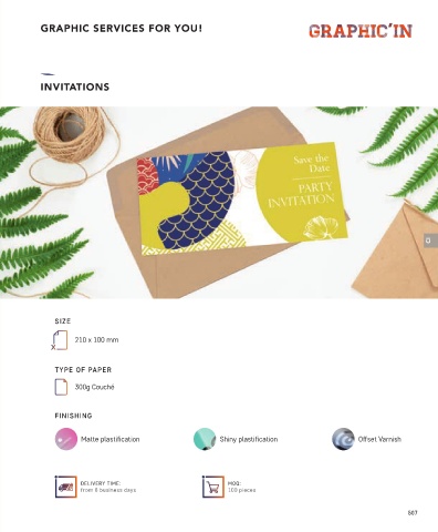 GRAPHIC SERVICES FOR YOU! INVITATIONS CI SIZE 210 x 100 mm TYPE OF PAPER 300g Couché FINISHING Matte plastif cation Shiny plastif cation Of set Varnish DELIVERY TIME: MOQ: from 8 business days 100 pieces 507