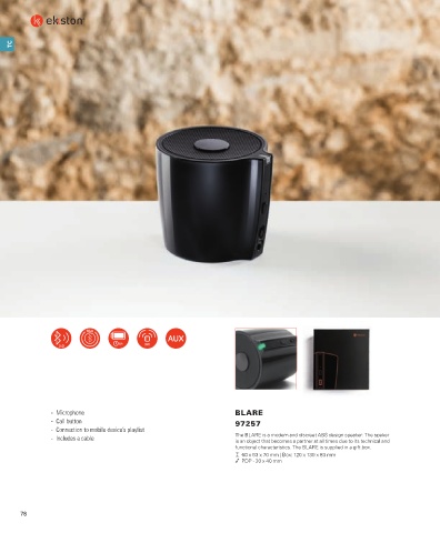 ‐ Includes a cable The BLARE is a modern and discreet ABS design speaker. The speker