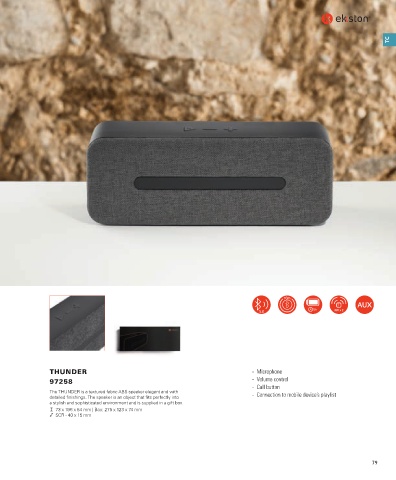 The THUNDER is a textured fabric ABS speaker elegant and with ‐ Connection to mobile device’s playlist