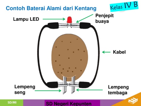 Contoh Baterai Alami dari Kentang Penjepit Lampu LED buaya Kabel Lempeng Lempeng seng tembaga SD Negeri Kepunten