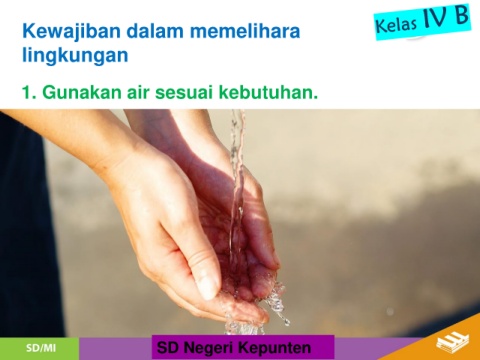 Kewajiban dalam memelihara lingkungan 1. Gunakan air sesuai kebutuhan. SD Negeri Kepunten
