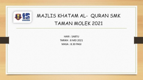 MAJLIS KHATAM AL- QURAN SMK TAMAN MOLEK 2021 HARI : SABTU TARIKH : 8 MEI 2021 MASA : 8.30 PAGI