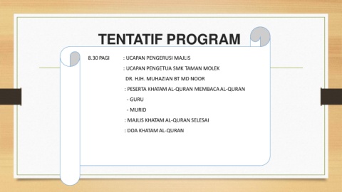 TENTATIF PROGRAM 8.30 PAGI : UCAPAN PENGERUSI MAJLIS : UCAPAN PENGETUA SMK TAMAN MOLEK DR. HJH. MUHAZIAN BT MD NOOR : PESERTA KHATAM AL-QURAN MEMBACAAL-QURAN - GURU - MURID : MAJLIS KHATAM AL-QURAN SELESAI : DOA KHATAM AL-QURAN