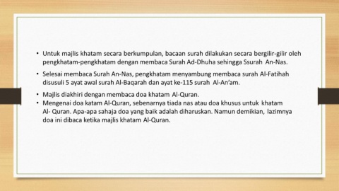 • Untuk majlis khatam secara berkumpulan, bacaan surah dilakukan secara bergilir-gilir oleh