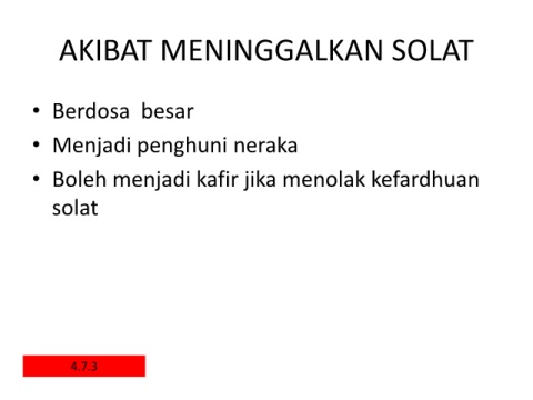 AKIBAT MENINGGALKAN SOLAT • Berdosa besar • Menjadi penghuni neraka • Boleh menjadi kafir jika menolak kefardhuan solat 4.7.3