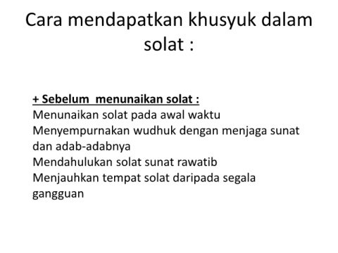 Cara mendapatkan khusyuk dalam solat : + Sebelum menunaikan solat : Menunaikan solat pada awal waktu Menyempurnakan wudhuk dengan menjaga sunat dan adab-adabnya Mendahulukan solat sunat rawatib Menjauhkan tempat solat daripada segala gangguan
