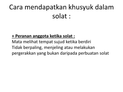 Cara mendapatkan khusyuk dalam solat : + Peranan anggota ketika solat : Mata melihat tempat sujud ketika berdiri Tidak berpaling, menjeling atau melakukan pergerakkan yang bukan daripada perbuatan solat
